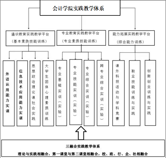 会计学院以培养应用型人才为目标,一直不断调整和修订各专业的实践课程体系使之不断完善。目前会计学、财务管理、审计学三个专业的实践教学体系采用通识教育、专业教育、能力拓展三层推进的实践教学模式。通过三层推进的实践教学模式支撑了理论与仿真实践相结合,技能学习和自主创新相结合,课内教学和课外竞赛相结合的实践教学理念,不断提升了学生的实践动手能力和职业素养。