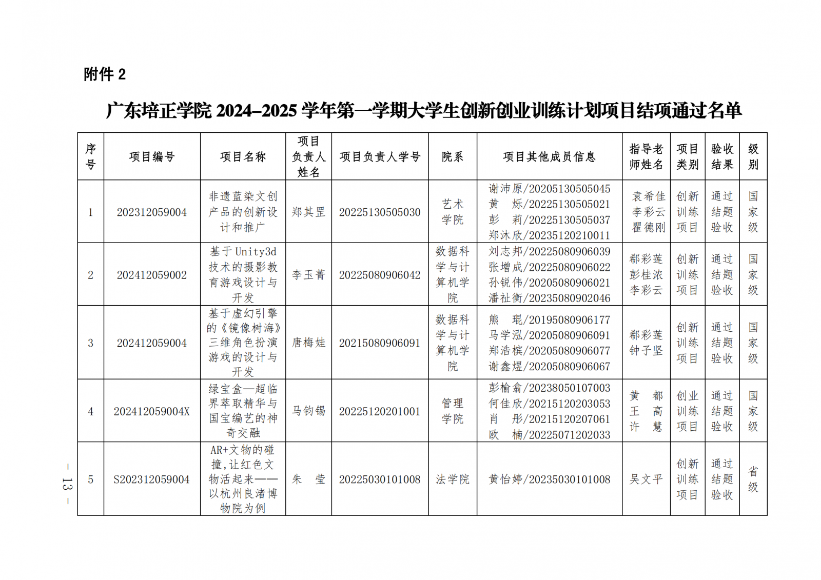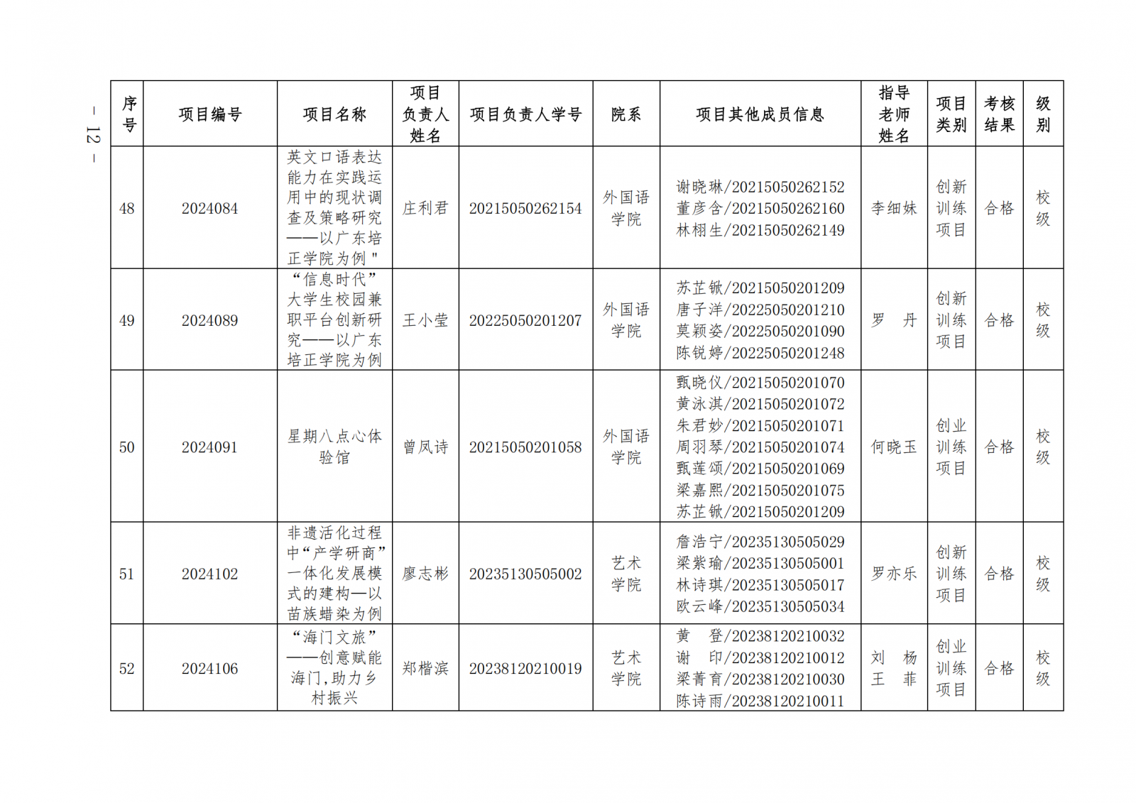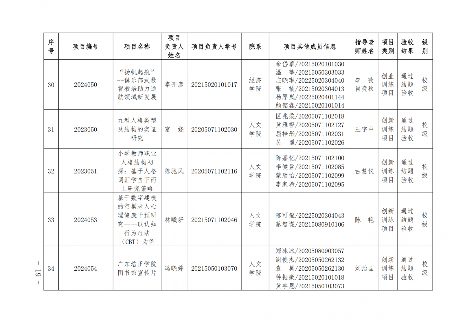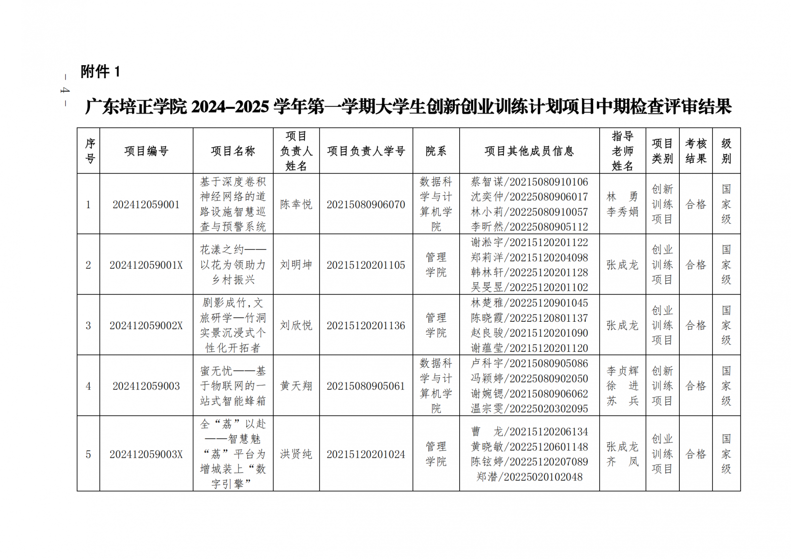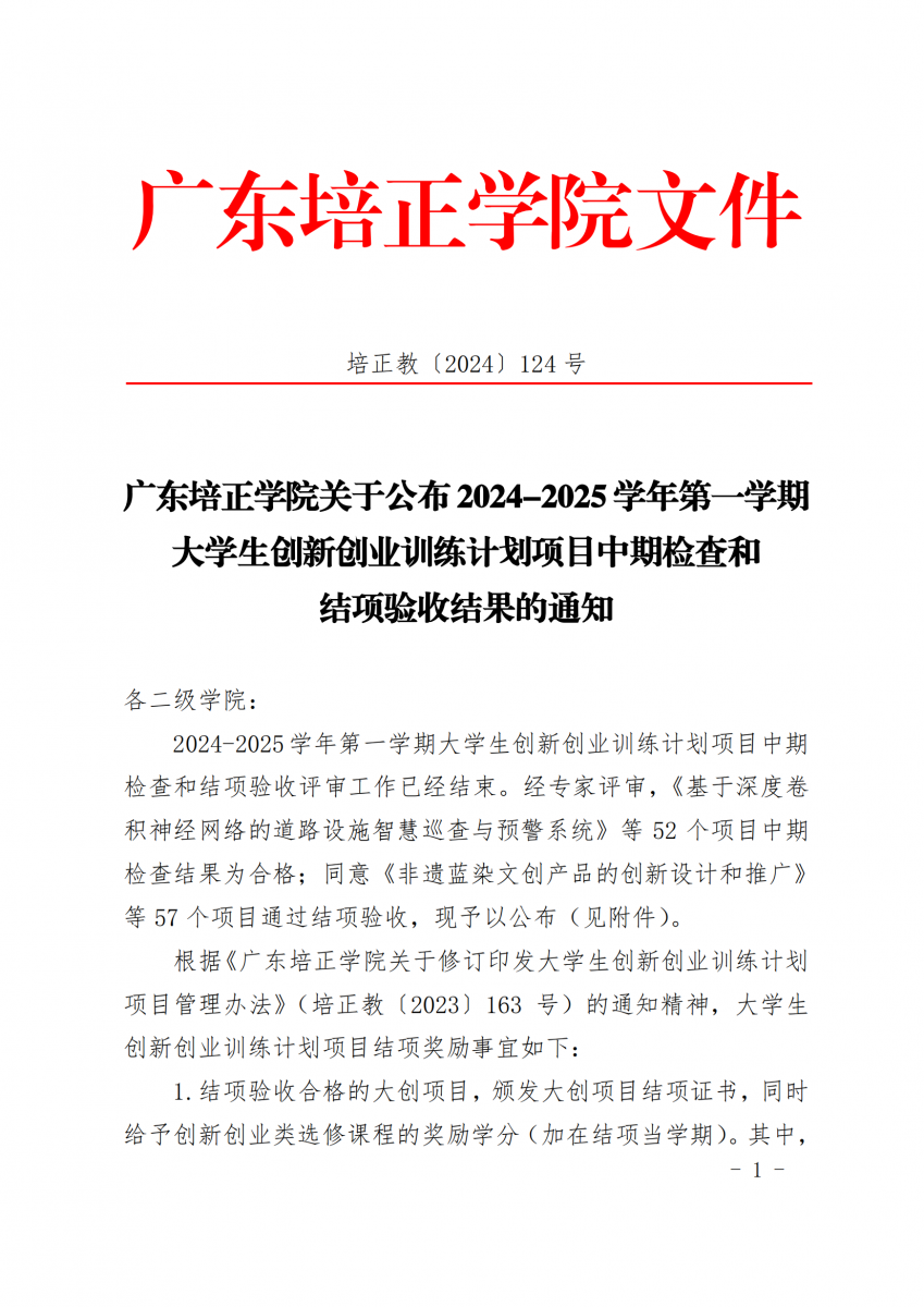 2024教124(广东培正学院关于公布2024-2025学年第一学期大学生创新创业训练计划项目中期检查和结项验收结果的通知)