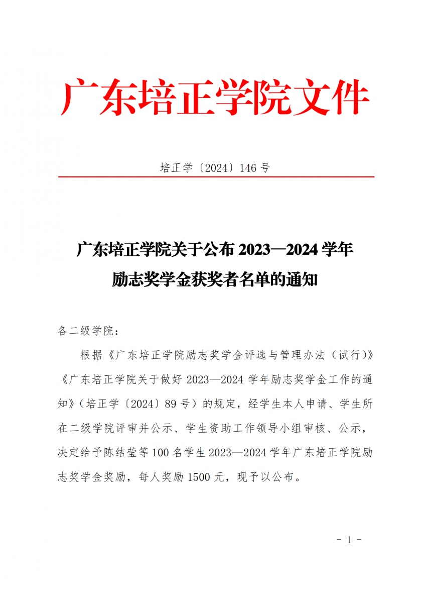 2024学146(广东培正学院关于公布2023—2024学年励志奖学金获奖者名单的通知)